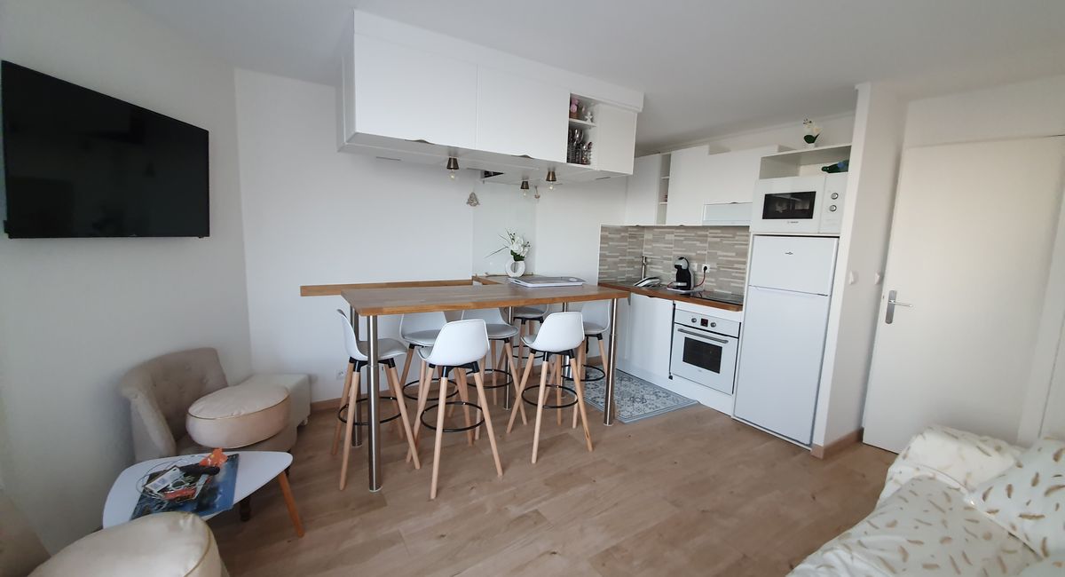 It has been completely renovated and comprises a very bright lounge-living room-kitchen*, a bathroom with Italian shower, washing machine-dryer, storage unit; separate WC, 1 bedroom (double bed 140 x 190), storage cupboard; 1 closed bedroom cabin with 2 bunk beds (90 x 190); 1 rapido sofa (2 people) in the lounge; fitted kitchen* (oven, microwave, fridge-freezer, Dolce-Gusto coffee machine, mixer, kettle, raclette machine, ..), iron,